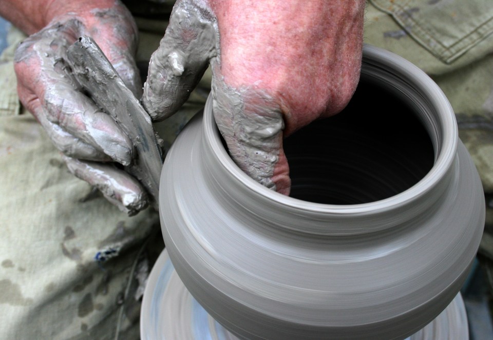 Hands shaping clay on potter’s wheel