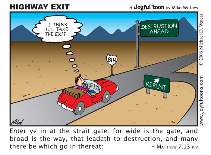 July 31, 2016 Highway Exit – Matthew 7:13 The Hebrew word translated repent is nacham, which means to turn around, or change one’s mind. On the highway of sin, there is only one destination. Repentance takes us in the opposite direction, to the road that leads to life. January 1, 2007